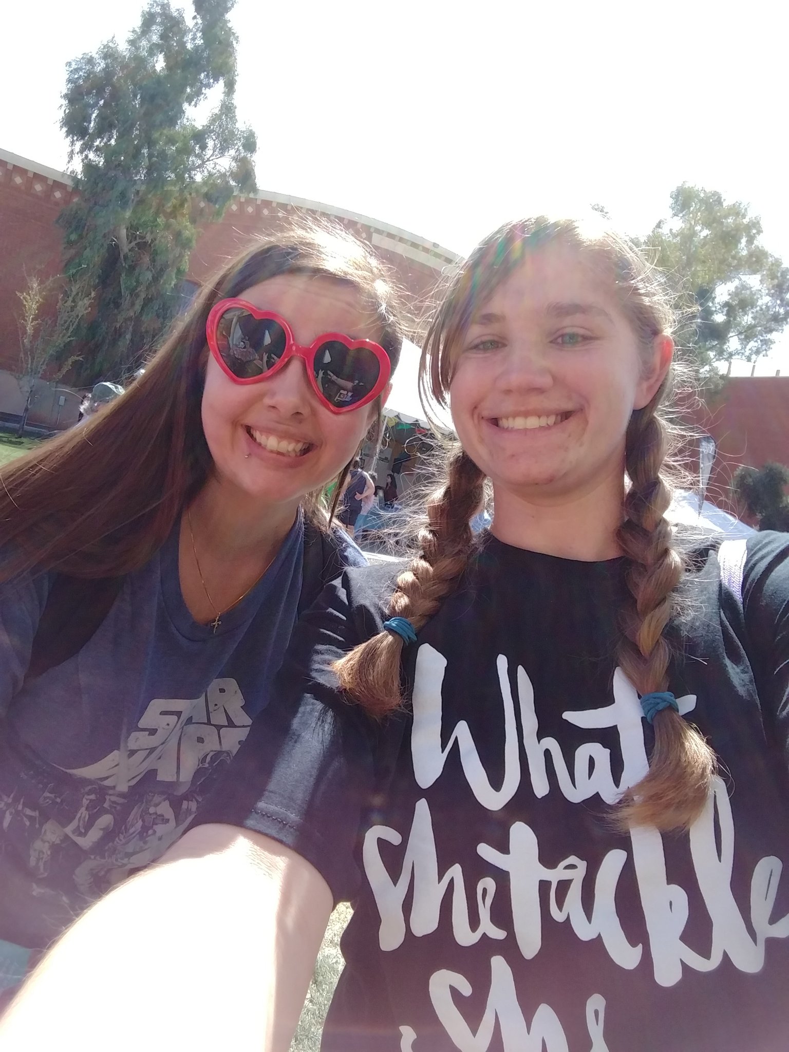 On to day two! Once again, I braved the festival all by my lonesome. First stop was to hangout with Ginger Scott at the Arizona Indies tent. Those ladies were a blast. You have no idea. 10 AM brought the Dystopian Worlds panel featuring James Dashner, Alexandra Bracken, and Sharon Cameron. Once again, it was a lovely panel and the authors were great, but I learned from yesterdays mistake and dipped out 30 minutes early to line back up for Dashner. This time I was back with the book he said I should read because a character had my name in book two. Alas, it was my turn. "You're back!" he said. I was. He began to sign my new book and then... "Oh man, Gabriella with two L's. Mine only has one." What a shame, but it's okay. We didn't take a second picture. Next I lined up for Alexandra Bracken and while signing my book she had a little brainfart and started to write the B before anything else. Technically my book is signed twice and it's unique and I love it, brainfart and all. Sharon Cameron was also very sweet. I'm so excited to read The Forgetting, you have no idea. During the panel when she was describing it James said, "That is the single greatest premise for a book I have ever heard. I'm now mad at you for stealing it from me." and we all laughed. What an awesome group of humans. I should also mention that day two I met some new friends in line and chatted about books. These kind people being Erica, Jen, and Karen. Book festivals are such a great way to make friends. Even if you make them by inserting yourself into people's conversations like I do on occasion. After all of that fun I wandered back to the Arizona Indies tent and asked Ginger if she wanted to go grab a coffee before my V.E. Schwab signing. Turned out she had no idea she was there and so we went there instead to buy a book and surprise her husband. So sweet. I also practically force fed her some Hi-Chews and we agreed that it's the best way to make friends. I rounded out my adventures by stopping by to see a friend, Kathleen Glasgow and have a chat. Upon walking up, I noticed Shaun and I had the same shirt on which called for a second picture if you ask me. The conversation was fun and short, but totally worth it. Before I left, I grabbed one of Ginger's books and had her sign it. Oh and Erica spotted me again and snagged a picture.